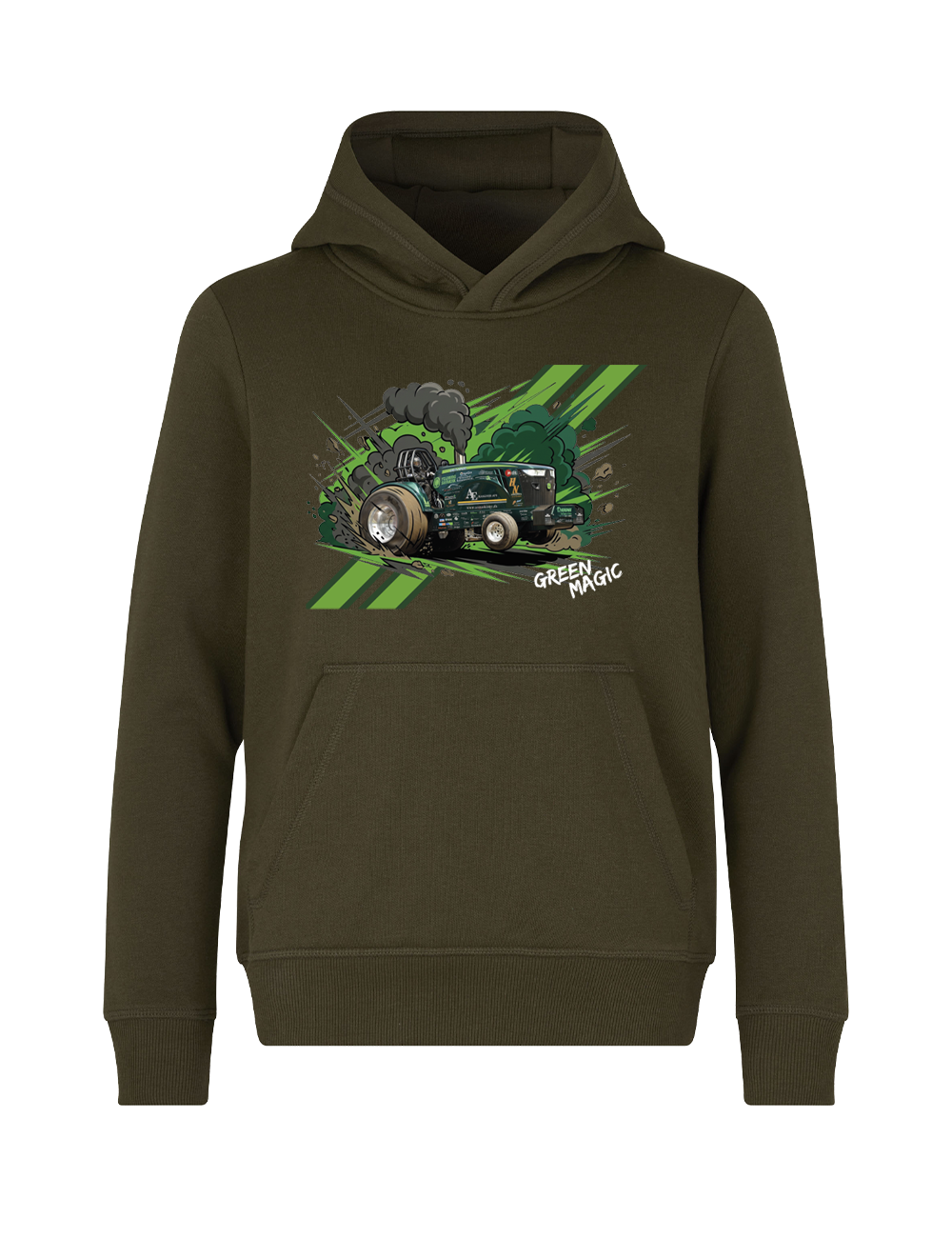 En hoodie til dig, der vil vise Green Magic med power og attitude. Det dynamiske frontmotiv med traktoren i fuld aktion kombinerer fart, røg og de karakteristiske grønne striber i et energifyldt design, der tydeligt signalerer passion for traktortræk og motorsport.