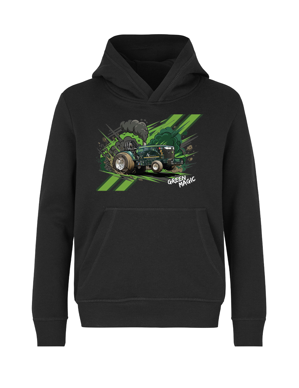 En hoodie til dig, der vil vise Green Magic med power og attitude. Det dynamiske frontmotiv med traktoren i fuld aktion kombinerer fart, røg og de karakteristiske grønne striber i et energifyldt design, der tydeligt signalerer passion for traktortræk og motorsport.